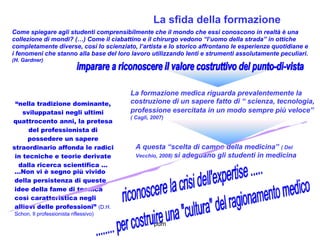 Il documento descrive un percorso formativo innovativo per gli studenti del secondo anno di medicina, che utilizza i film come strumento per promuovere un sapere riflessivo e una consapevolezza critica sul ruolo del professionista della salute. Vengono presentate diverse tematiche legate alla formazione medica, come l'importanza della narrazione, l'integrazione di esperienze personali e la costruzione di un'identità professionale. Il programma mira a sviluppare competenze di autoriflessione e a facilitare l'apprendimento in un contesto protetto, valorizzando le esperienze vissute dagli studenti.