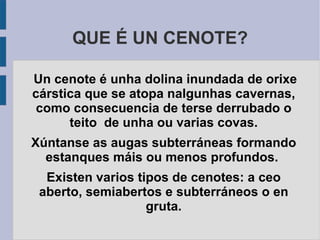 QUE É UNCENOTE? Un cenote é unha dolina inundada de orixe cárstica que se atopa nalgunhas cavernas, como consecuencia de terse derrubado o teito de unha ou varias covas. Xúntanse as augas subterráneas formando estanques máis ou menos profundos. Existen varios tipos de cenotes: a ceo aberto, semiabertos e subterráneos o en gruta.