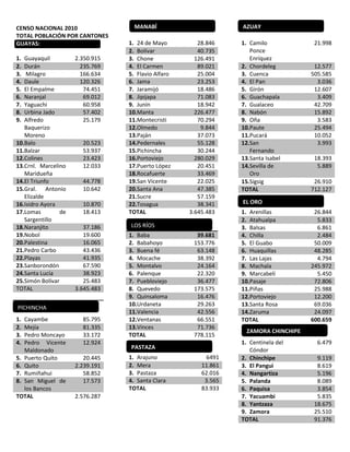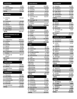 This document provides population data from the 2010 Ecuadorian census for various provinces and cantons. It lists the name of each canton and its total population. Some of the provinces included are Guayas, Manabí, Azuay, Los Ríos, Pichincha, Pastaza, Santo Domingo de los Tsáchilas, Tungurahua, Cañar, Loja, Santa Elena, Esmeraldas, Bolívar, Chimborazo, and Cotopaxi. The population numbers range from a few thousand to over 2 million for the largest cantons.