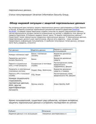 Документ обсуждает необходимость защиты персональных данных и анализирует реакцию различных компаний на компрометацию данных их пользователей, включая eBay, Google, LinkedIn и Facebook. Он также рассматривает мировую ситуацию с защитой персональных данных, основные угрозы, связанные с ботнетами, а также роль организаций, заинтересованных в защите данных. В заключение, документ подчеркивает важность создания более эффективных механизмов для устранения инцидентов, связанных с утечками персональных данных.