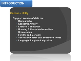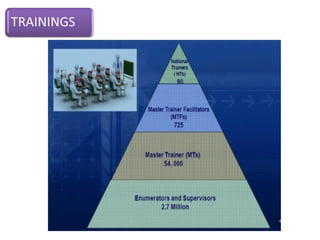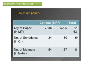 The document provides information about the planning process for the Census of India 2011. It discusses updating the administrative boundaries and assigning location codes to all villages, towns, districts etc. to create a complete frame for the census. It also describes the organizational structure established with officials at national, state, district and local levels to conduct the census. The census follows a de facto method using direct visits to households over a 3-week period to collect demographic and other data from all individuals in the country.