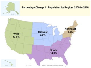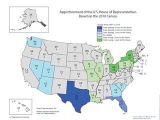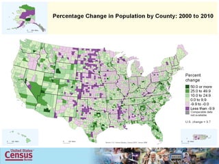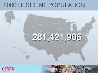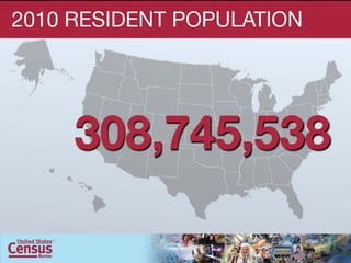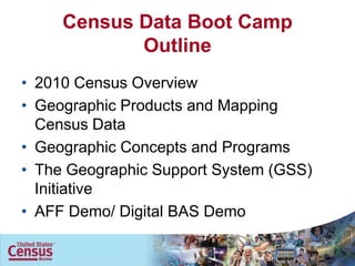 This document summarizes a census data boot camp covering topics like the 2010 census overview, geographic products and mapping census data, geographic concepts and programs, and the geographic support system initiative. It describes the 2010 census questionnaire, ensuring confidentiality of responses, and the five phases of the 2010 census redistricting data program which involves collecting state and local district boundary data to tabulate and deliver 2010 census results.