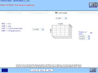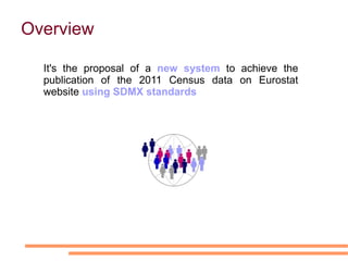The Census European Hub Project aims to establish a new system for disseminating 2011 census data on the Eurostat website using SDMX standards, enhancing flexibility and access to detailed, comparable data across EU member states. The pilot project, initiated in collaboration with several countries, explores the implementation of this system through data sharing, enabling countries to provide easily accessible census data via a central hub. The project is expected to reduce production costs, improve infrastructure, and facilitate the use of international standards in data management.