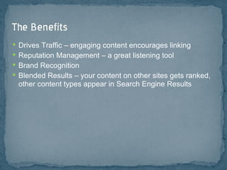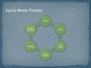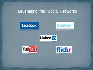 This document provides guidance on using social media for business purposes. It discusses finding your target market and defining goals. It then provides tips on using various social media platforms like Facebook, Twitter, LinkedIn, YouTube and Flickr to engage customers, build your brand, generate leads and increase sales. It emphasizes focusing on quality, engaging content over hard selling and establishing genuine relationships and conversations through social media interactions.
