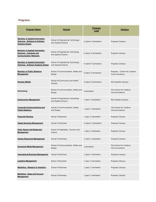 Centennial College offers post-secondary and post-graduate programs across several schools and campuses. Programs are available in various fields including business, health, engineering, hospitality and more. Admission requirements vary depending on the level of program but generally require a minimum grade of 50% in previous education levels and an IELTS score of at least 6.0 overall. The document provides details on over 50 specific programs offered across Centennial College including their duration, campus location, and school.