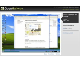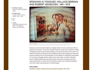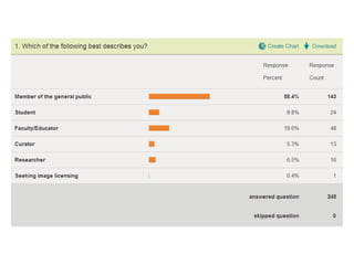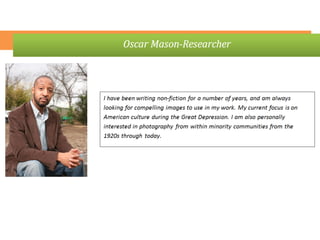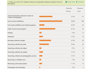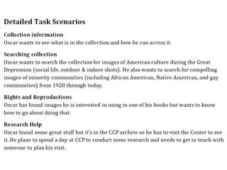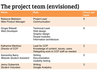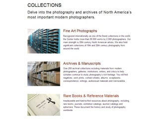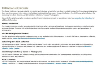 The document outlines the redesign of the Center for Creative Photography website, including defining project roles and time commitments, conducting user research, structuring content types, and implementing a responsive design using Drupal to improve maintenance and accessibility of the site.