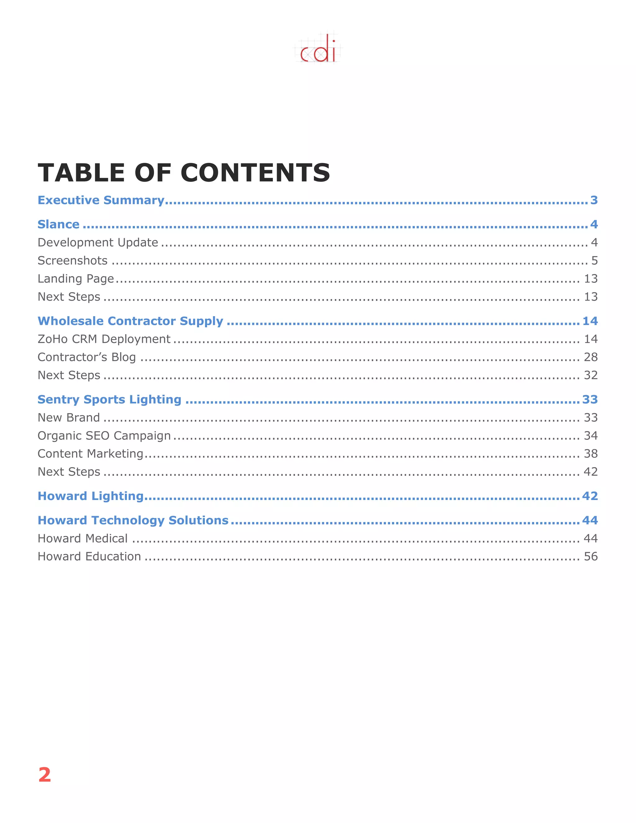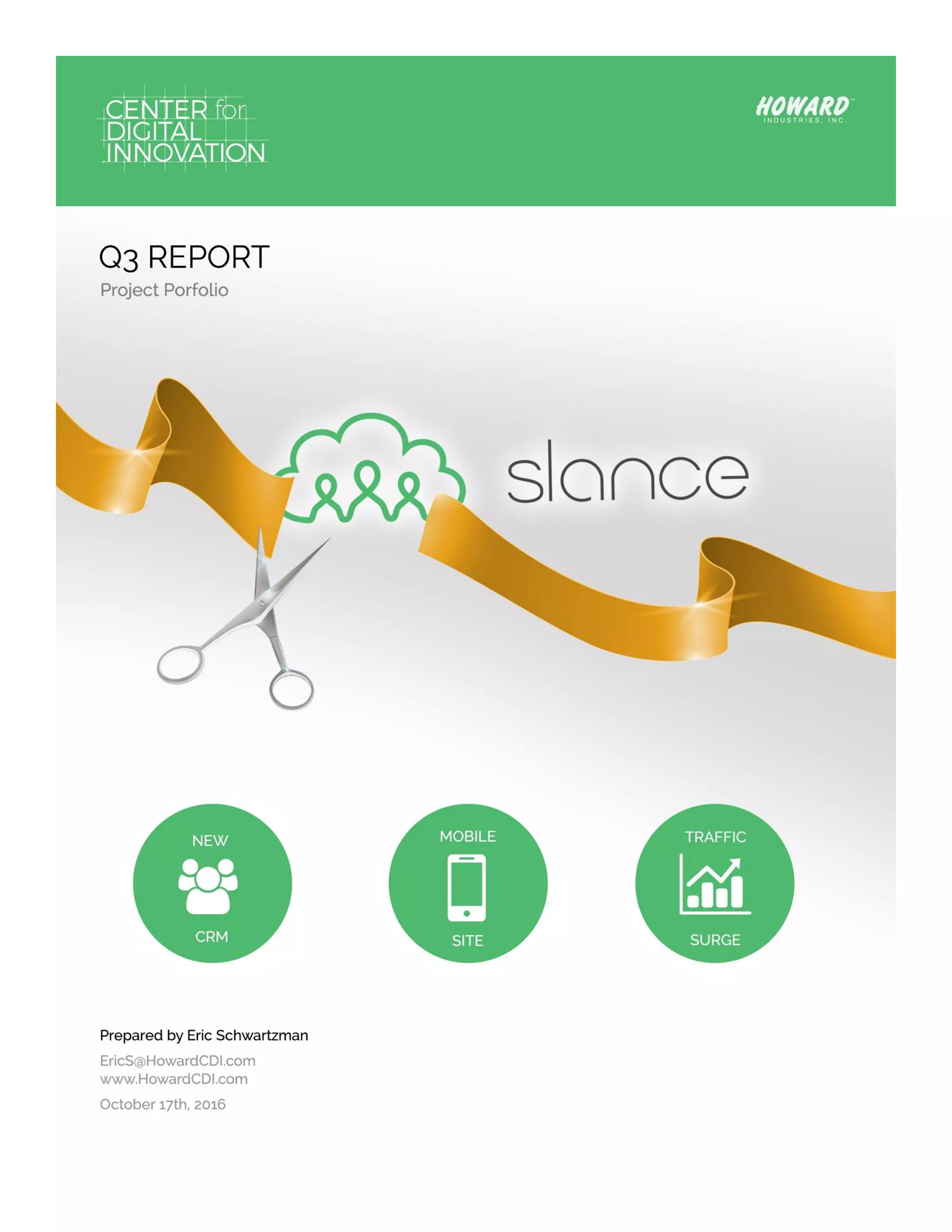 The document provides an executive summary and updates on various projects undertaken by the Center for Digital Innovation (CDI) for Howard Industries in Q3 2016, highlighting achievements such as the upcoming launch of a private beta for the Slance freelancer marketplace and significant revenue growth for Wholesale Contractor Supply through SEO efforts. It also details improvements made to websites for different divisions and outlines next steps for ongoing and future initiatives. Overall, the report emphasizes the value added by CDI in enhancing digital strategies and increasing sales across Howard Industries' businesses.