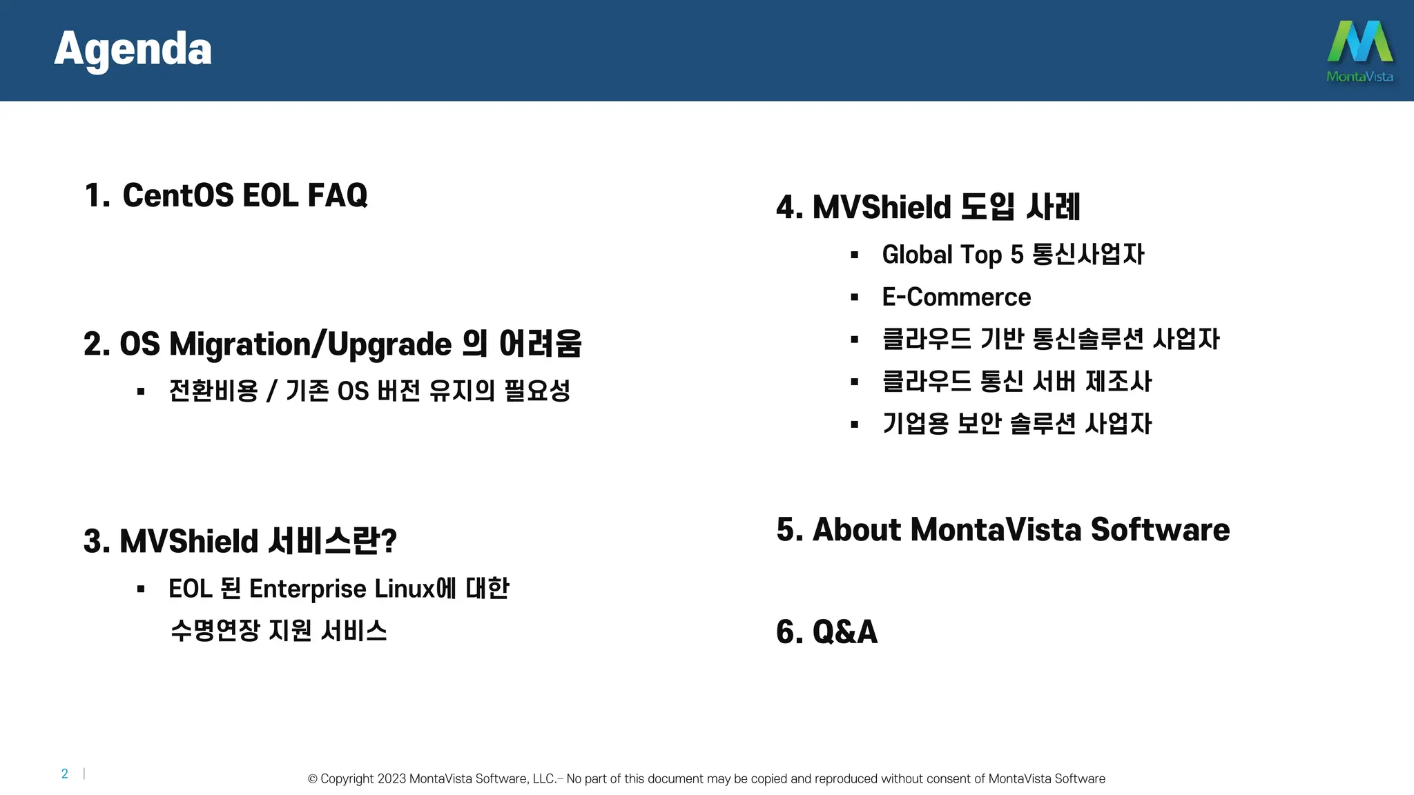 IT 업계에서 가장 많이 사용되는 OS인 CentOS7.9 의 EOL 이 임박했습니다. 많은 업체들이 신규버전 OS로의 Migration을 계획하고 있지만, 그럴 필요가 없습니다. 글로벌 리눅스 OS 벤더인 MontaVista의 MVShield 서비스는 CentOS EOL 버전에 대한 연장지원 서비스를 제공합니다. 이미 많은 글로벌 기업들이 MVShield 서비스를 통해 불필요한 OS 업그레이드/마이그레이션을 회피하고, 안정적으로 서비스를 운용하고 있습니다. 다양한 MVShield 도입 사례를 살펴보시기 바랍니다.