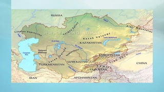 The document presents a detailed overview of Central Asia, covering its geographical features, climate, population, economy, and cultural aspects across five countries: Kazakhstan, Uzbekistan, Turkmenistan, Kyrgyzstan, and Tajikistan. It highlights significant landforms, climate classifications, economic sectors, and resources, showcasing the region's rich natural and cultural heritage. Additionally, it discusses the demographic trends and the ethnic diversity within the region, emphasizing the predominant Muslim population and various cultural traditions.