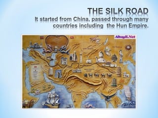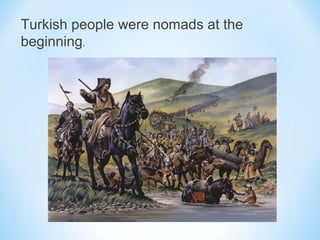 Turkish people originated as nomadic herders in Central Asia but some groups like the Huns and Uygurs established governments and struggled with China for control over the Silk Road, an important trade route. Over time, some Turkish tribes like the Huns migrated westward into Europe, with some settling in areas that became modern-day Hungary, named after the Hunnic Turks.