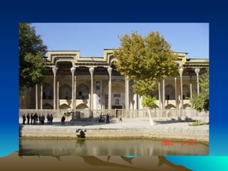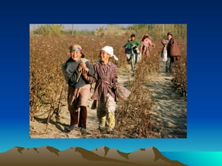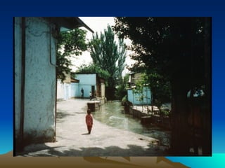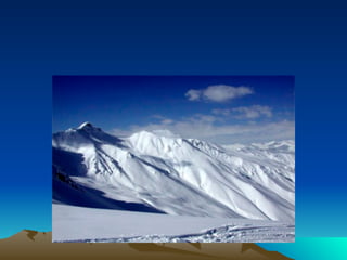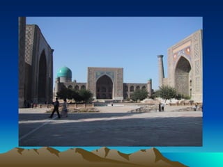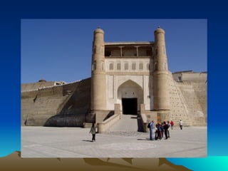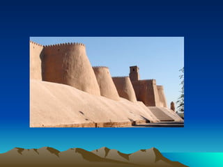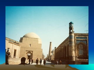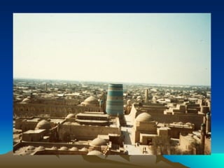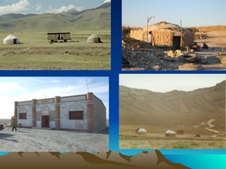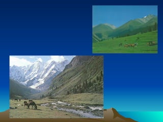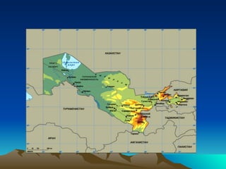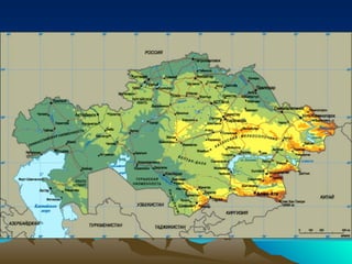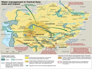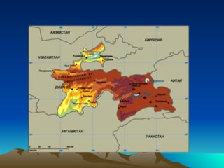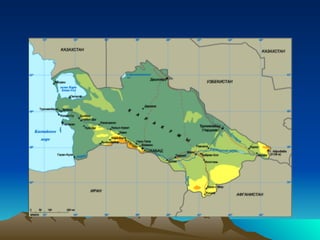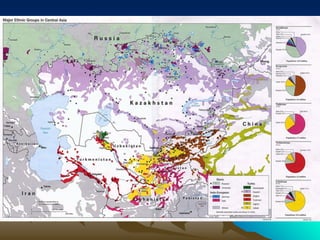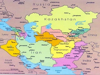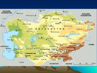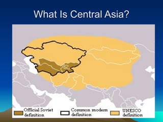 Central Asia is a vast region located in inner Eurasia with varied climates and topography. It lacks clear borders or demarcation lines. The population of over 61 million people includes both settled groups in oases and valleys as well as nomadic groups in deserts and steppes. Some of the key geographic facts about Central Asia are that it covers an area of 4 million square kilometers, has over 12,000 km of land borders with neighboring countries, and contains 3,662 km of coastline along the Caspian Sea.