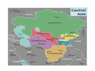 Central Asia includes 5 countries - Kazakhstan, Kyrgyzstan, Tajikistan, Turkmenistan, and Uzbekistan. The document provides details on the geography, attractions, and highlights of each country. Kazakhstan offers mountains, forests, canyons, and rivers for recreation. Popular attractions include Almaty, Medeo speed skating rink, Astana, and Baikonur Cosmodrome space launch center. Kyrgyzstan is known for its mountains, lakes, and yurt culture. Key attractions are Sary Chelek Reserve, Tash Rabat caravanserai, Ala Too Square, and Lake Issyk Kul. Tajikistan has dramatic landscapes and the historic Pam