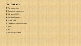 The central nervous system is comprised of the brain and spinal cord. The brain controls bodily functions and awareness through different regions like the cerebrum, cerebellum, and brain stem. The cerebrum controls complex brain functions. The cerebellum coordinates movement and balance. The brain stem regulates vital functions like breathing and heart rate. The spinal cord connects the brain to the body and enables reflexes. The peripheral nervous system includes nerves throughout the body. The autonomic nervous system regulates involuntary functions through the sympathetic and parasympathetic nervous systems.