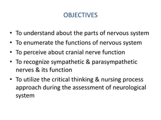 This document provides an overview of the nervous system including its anatomy and physiology. It discusses the central nervous system including the brain, spinal cord and meninges. It describes the peripheral nervous system including cranial nerves and autonomic nervous system. Key cells, structures and functions are defined including neurons, glial cells, neurotransmitters, blood brain barrier and cerebrospinal fluid.