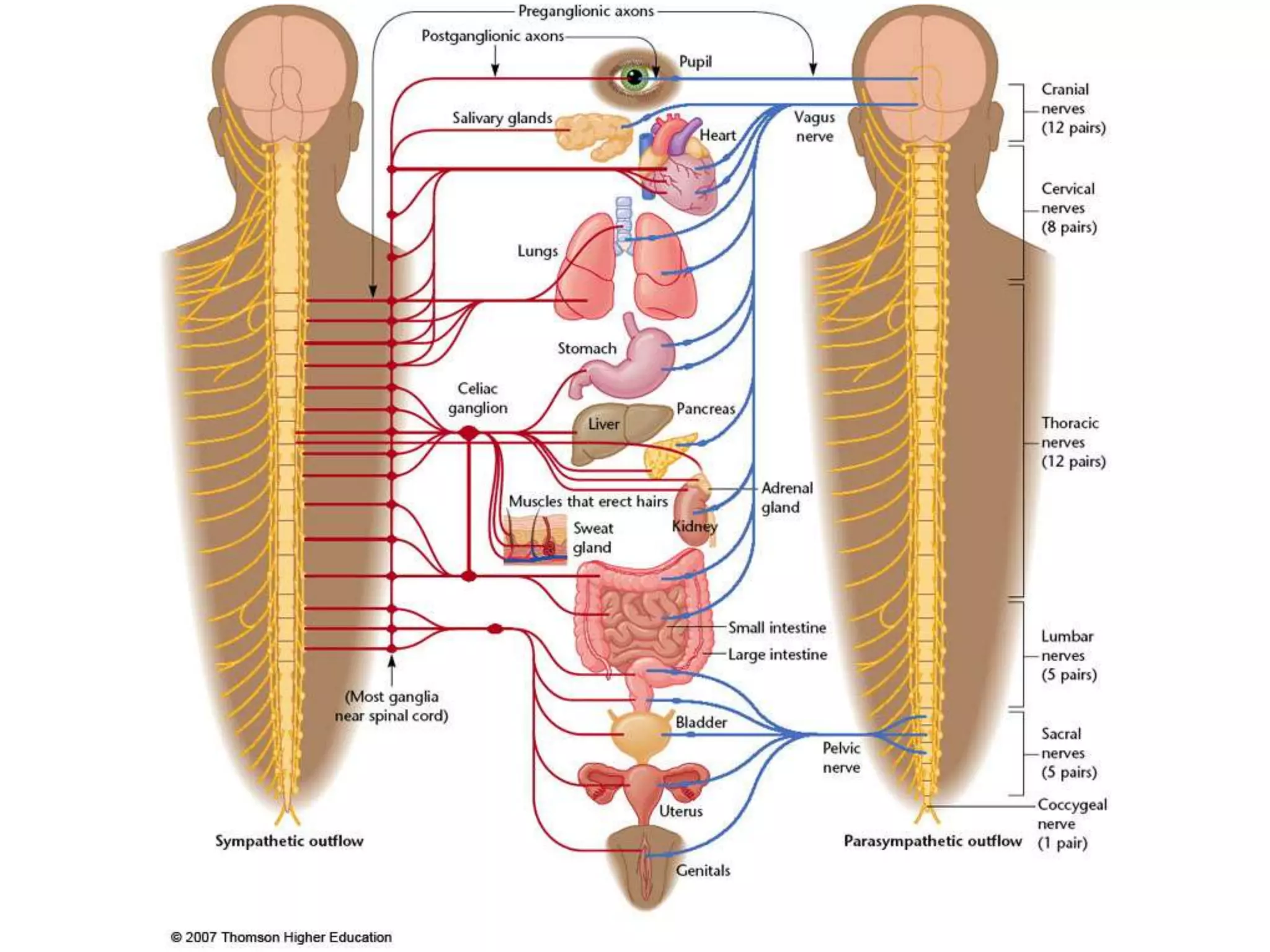 The document discusses the autonomic nervous system (ANS), which controls involuntary body functions like heart rate and digestion. It describes the ANS as having two divisions - the sympathetic and parasympathetic nervous systems. The sympathetic system activates the body during stress through pathways involving the hypothalamus, amygdala and periaqueductal grey matter. The parasympathetic system calms the body during rest. The enteric nervous system is also described as the "second brain" that helps control gastrointestinal functions.