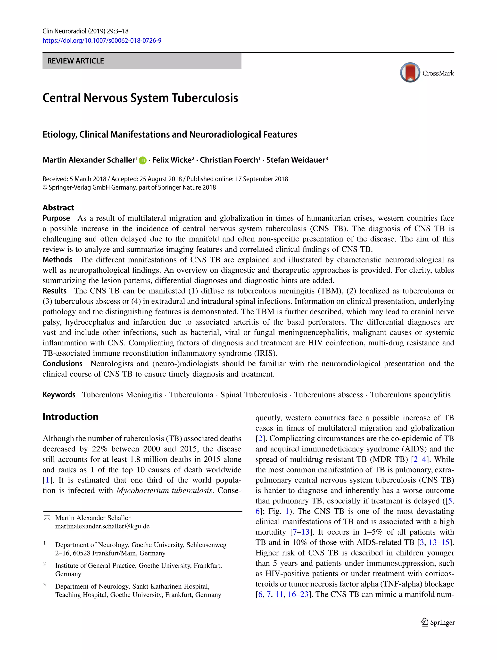 Central nervous system tuberculosis (CNS TB) can manifest in several ways, including tuberculous meningitis, tuberculomas, tuberculous abscesses, and spinal infections. Tuberculous meningitis is the most common manifestation and presents with nonspecific symptoms like headache, fever and neck stiffness. Imaging may show basal meningeal enhancement and hydrocephalus. Left untreated, complications can include cranial nerve palsies, infarcts and altered mental status. Neurologists and radiologists should be familiar with the clinical and imaging presentation of CNS TB to facilitate timely diagnosis and treatment.