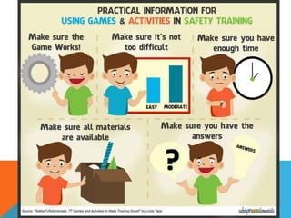 The document discusses various challenges faced by safety trainers, including keeping classes interesting and engaging trainees effectively. It emphasizes the importance of interactive and accelerated learning techniques to enhance knowledge retention and behavior change in trainees. Additionally, it highlights the role of positive emotions, physical activities, and diverse learning methods in creating a more effective training environment.