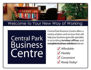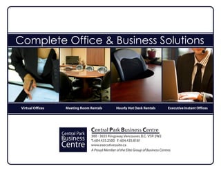 Central Park Business Centre offers various office and business solutions including virtual offices, meeting room rentals, and hot desk rentals, ideal for professionals seeking flexibility and convenience. The centre provides turnkey furnished office spaces with essential services such as high-speed internet, telephone support, and administrative assistance. Located on the Vancouver-Burnaby border, it boasts strategic access to transportation and nearby amenities.