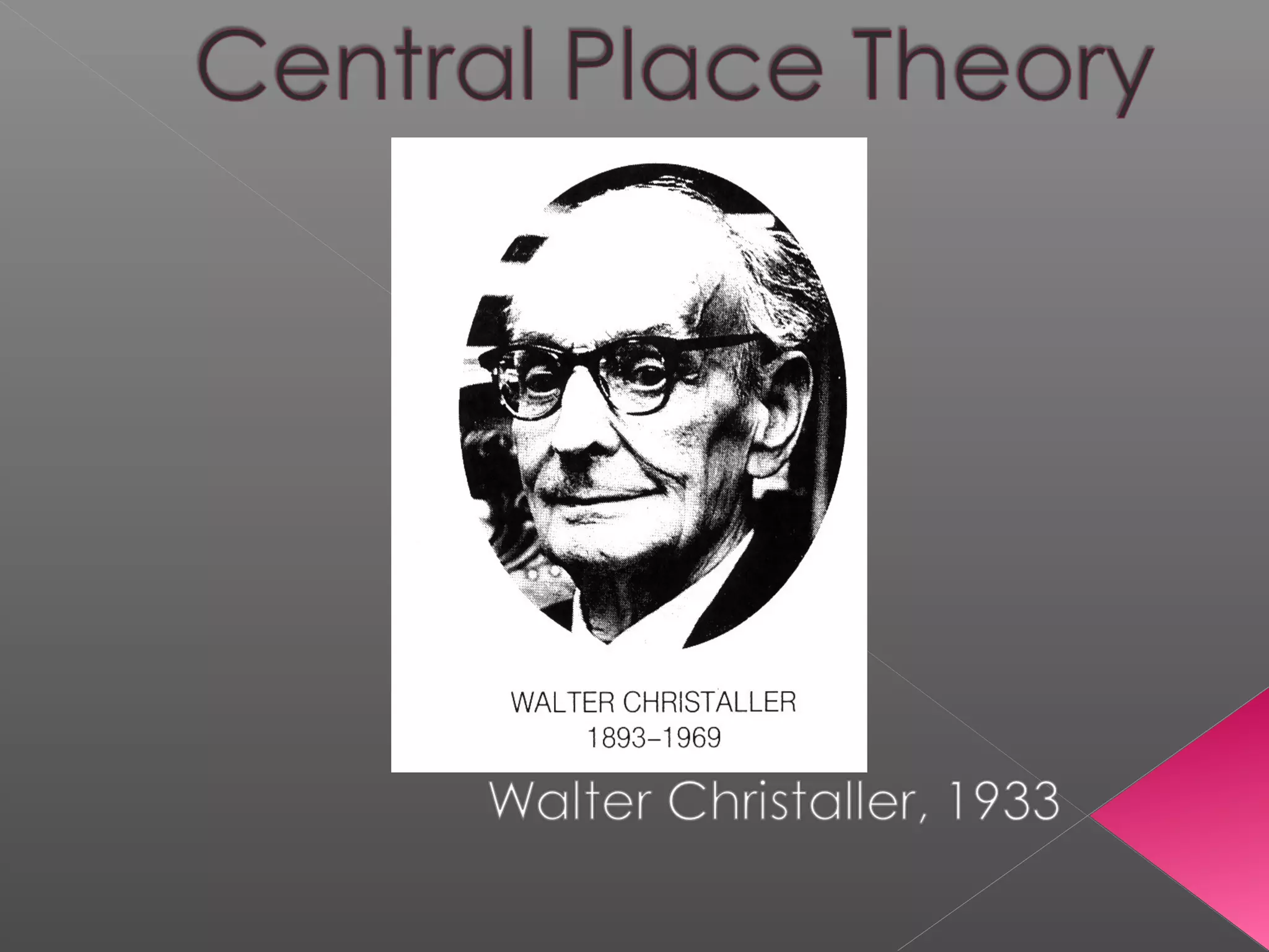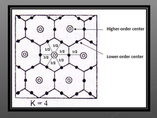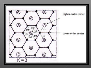 This document outlines Christaller's central place theory, which proposes that settlements develop in a hierarchical pattern to provide goods and services to surrounding areas. It describes the concepts of range, threshold, and sphere of influence. Christaller hypothesized that central places would be spatially distributed in a hexagonal arrangement to optimize access according to different principles (K values) of either marketing, transportation, or administration. However, the theory makes unrealistic assumptions and the predicted patterns are not always reflected in reality due to non-uniform population distributions and other factors.