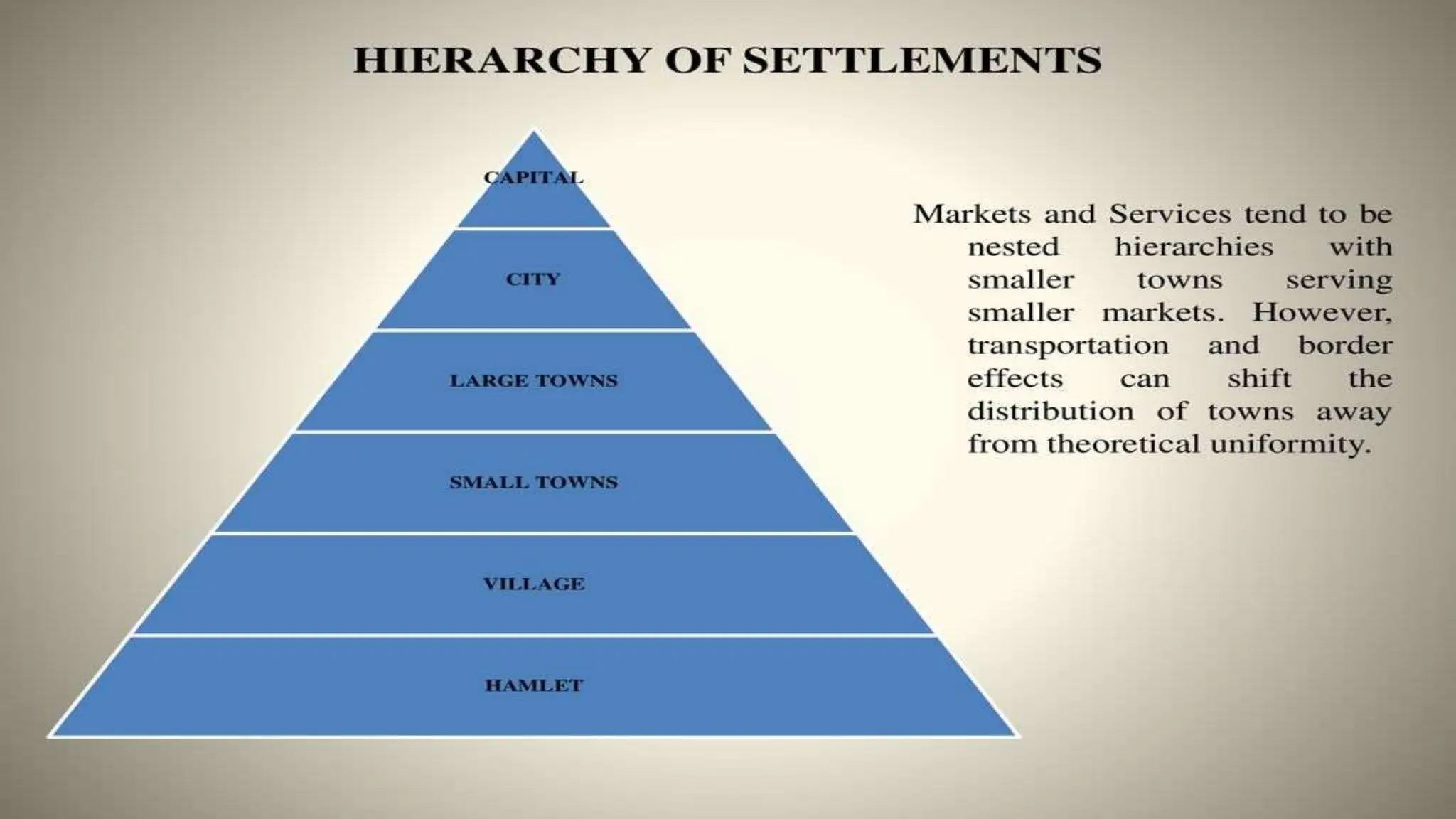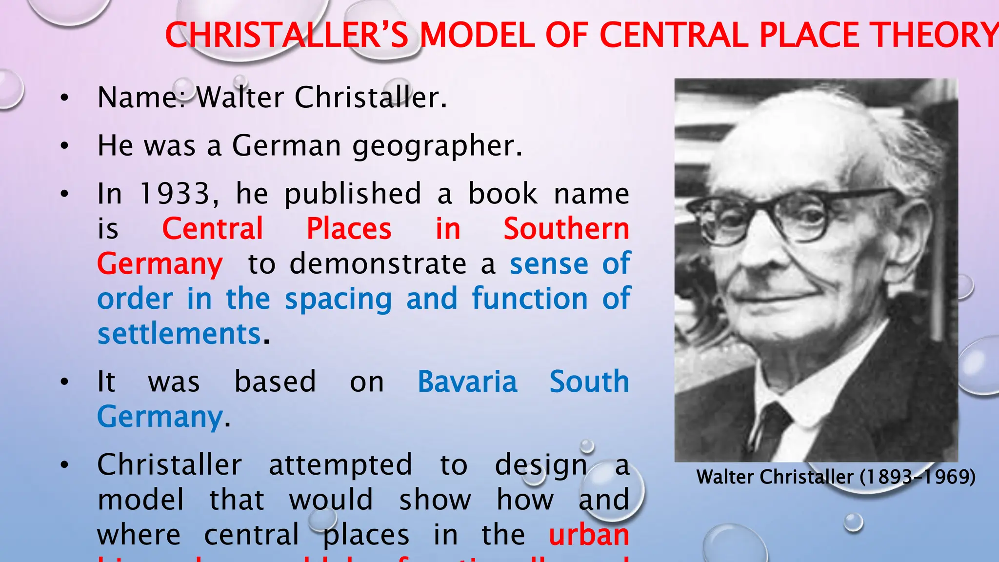 Central Place Theory, proposed by geographer Walter Christaller in 1933, describes the size, distribution, and function of urban settlements, primarily in Bavaria, Germany. It outlines several assumptions about population distribution, resource availability, and competition to explain how central places provide goods and services to surrounding areas, using principles that establish hierarchical layouts of settlements. While the theory has its applications, particularly in India, it has faced criticism for its unrealistic assumptions and inability to account for modern economic complexities.