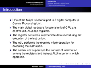 The document discusses the central processing unit (CPU) and its stack organization. It describes the CPU as having a control unit, arithmetic logic unit (ALU), and registers that store intermediate data during instruction execution. A stack is a storage device that stores items such that the last item stored is first retrieved. In CPU stack organization, a stack pointer register contains the address of the top item in the stack. Items are added to the stack by incrementing the pointer and writing to the new address (push), and removed by reading the top address and decrementing the pointer (pop).