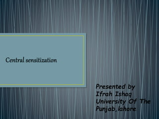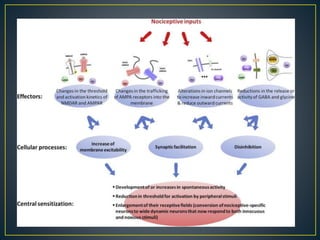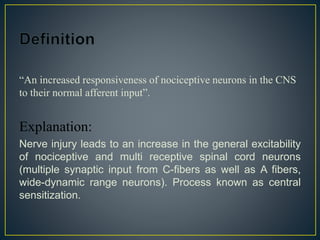 The document discusses central sensitization, which is an increased responsiveness of nociceptive neurons in the central nervous system to normal input. During central sensitization, there is an increase in the excitability of nociceptive and wide dynamic range spinal cord neurons. This leads to lower activation thresholds, increased responses to noxious and non-noxious stimuli, and expanded receptive fields. The mechanisms involve the release of neurotransmitters like glutamate and substance P, which activate receptors and intracellular signaling cascades to reduce the activation threshold of dorsal horn neurons.