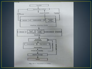 The Central Sterile Supply Department (CSSD) is responsible for receiving, processing, sterilizing, storing and distributing sterile supplies and equipment for hospitals. Key functions of the CSSD include cleaning, packaging, sterilizing items using autoclaves or ethylene oxide, storing sterile supplies, and issuing items to different hospital units. CSSDs aim to provide safe sterile supplies efficiently while standardizing equipment and assisting in infection control.