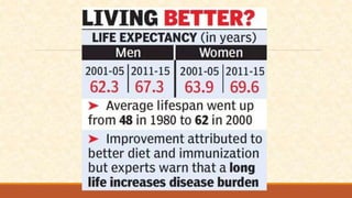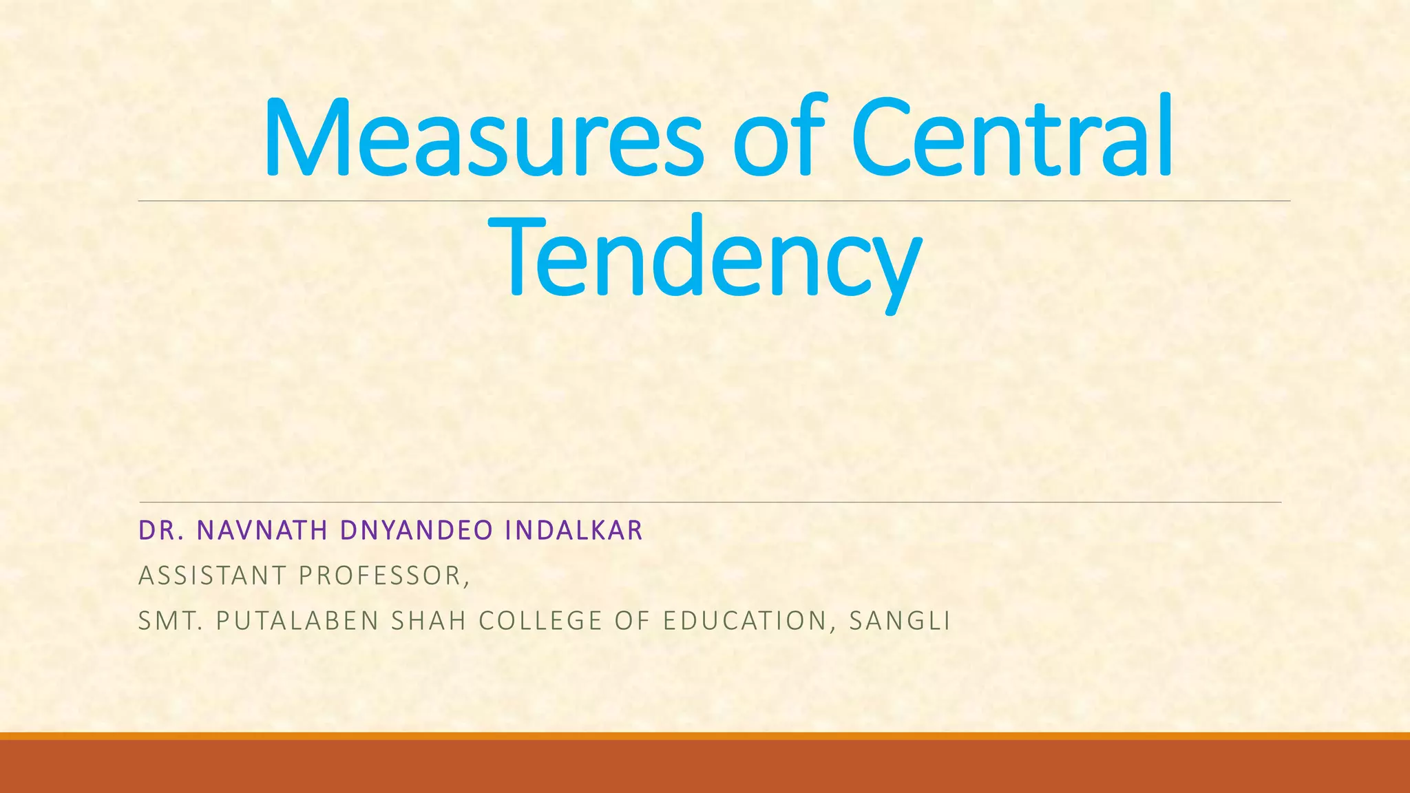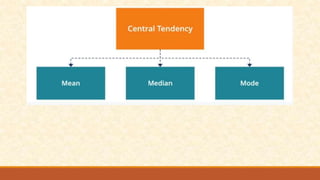 The document discusses different measures of central tendency including the mean, median, and mode. It provides formulas and examples for calculating each measure. The mean is the average value and is calculated by summing all values and dividing by the total number. The median is the middle value when values are arranged in order. The mode is the value that appears most frequently in a data set.