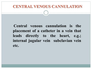 This document provides information about central venous cannulation and central venous pressure (CVP) measurement. It discusses the indications, contraindications, sites, techniques, and complications of central venous cannulation. The internal jugular vein and subclavian vein are described as common sites. Ultrasound guidance can help with visualization and decreases complications rates. CVP is measured by connecting a manometer to the central line and observing the fluid level, with normal ranges being from 3-8 cmH2O. Peripherally inserted central catheters are also discussed as an alternative approach.