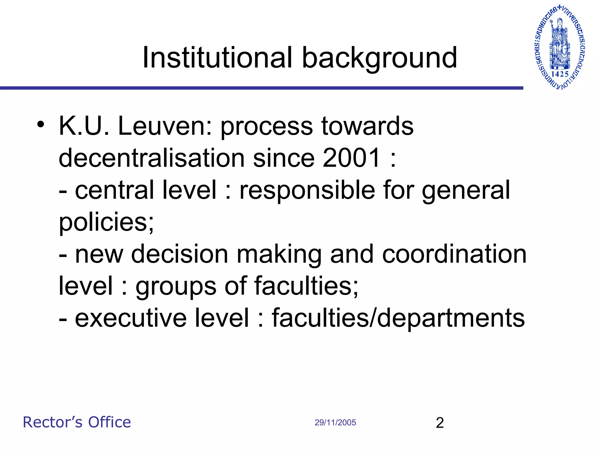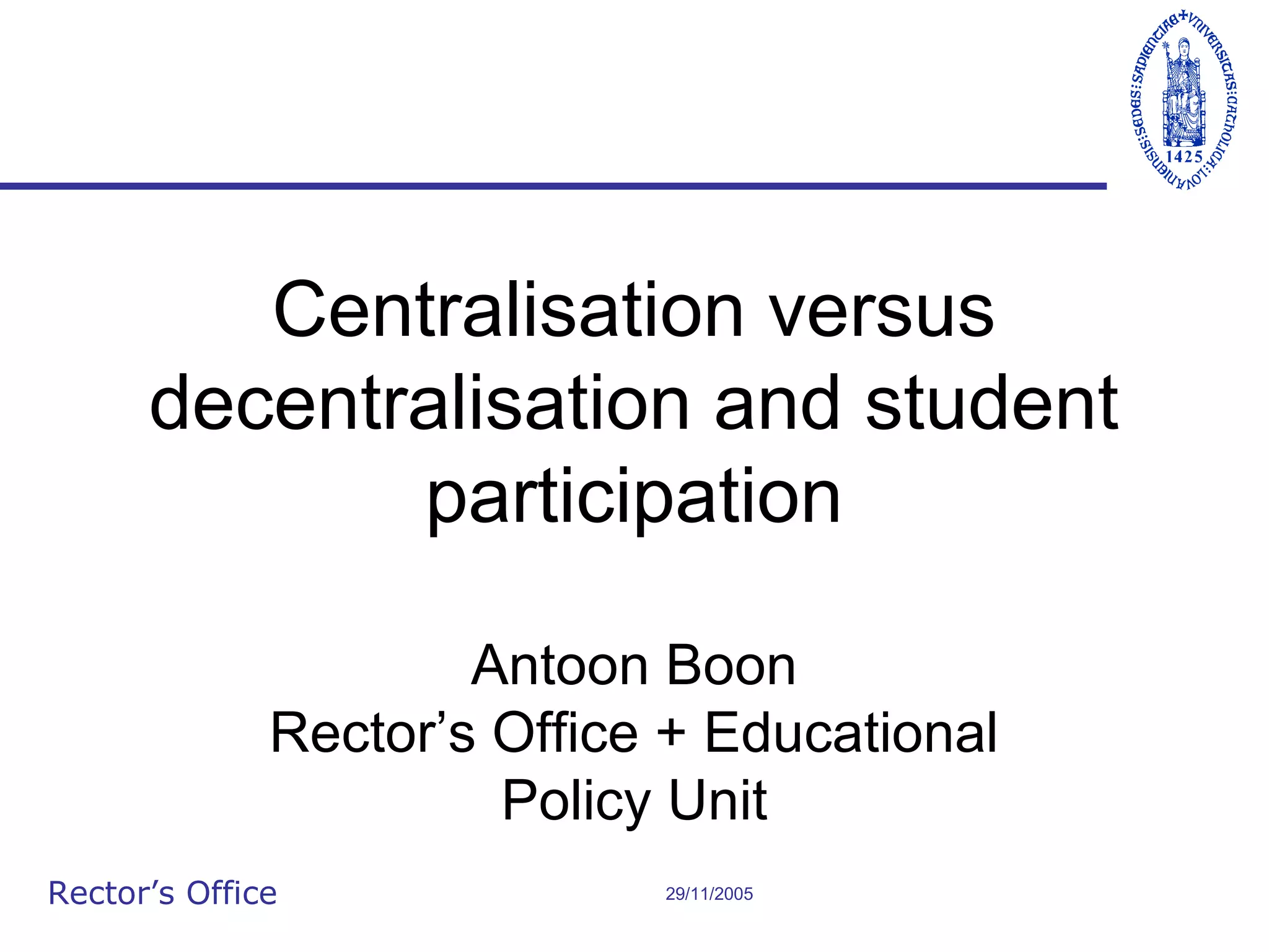 This document discusses the decentralization of decision making at KU Leuven university and the legal requirements for student participation. It describes how decision making authority has been decentralized from the central level to groups of faculties and individual faculties/departments since 2001. Belgian law requires universities to adopt either a co-decision or concertation model for student participation in governance. KU Leuven chose the co-decision model, where students have voting representation on all major decision-making bodies from the Board of Management down to the faculty level.