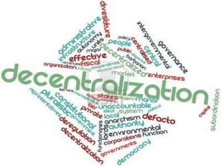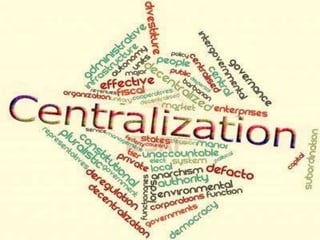 This document discusses and compares centralization and decentralization in organizational structures. Centralization refers to concentrating decision-making authority at higher levels of management, while decentralization involves dispersing authority to lower levels. The document outlines advantages and disadvantages of both approaches. Centralization can lead to delays and lack of initiative, while decentralization may cause coordination issues but improves motivation and decision making. Ultimately, the best structure depends on an organization's size, goals, and environment.