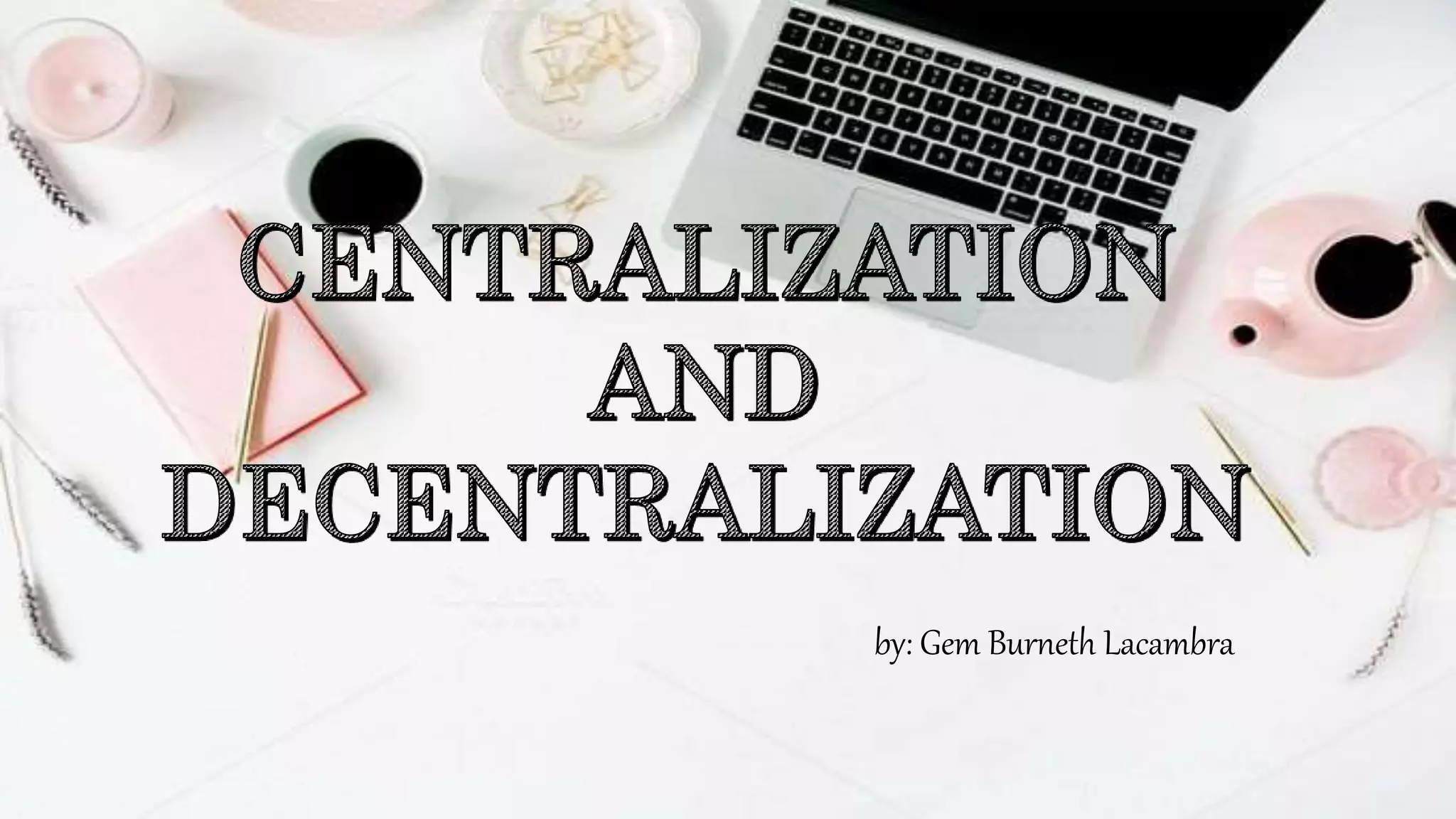 The document outlines two types of organizational structures: centralized and decentralized. Centralized organizations retain decision-making authority with top management, while decentralized organizations empower lower-level managers with decision-making responsibilities. It discusses the forces and reasons for both centralization and decentralization, including factors like organizational crisis, management control desires, and the need for professional manager development.