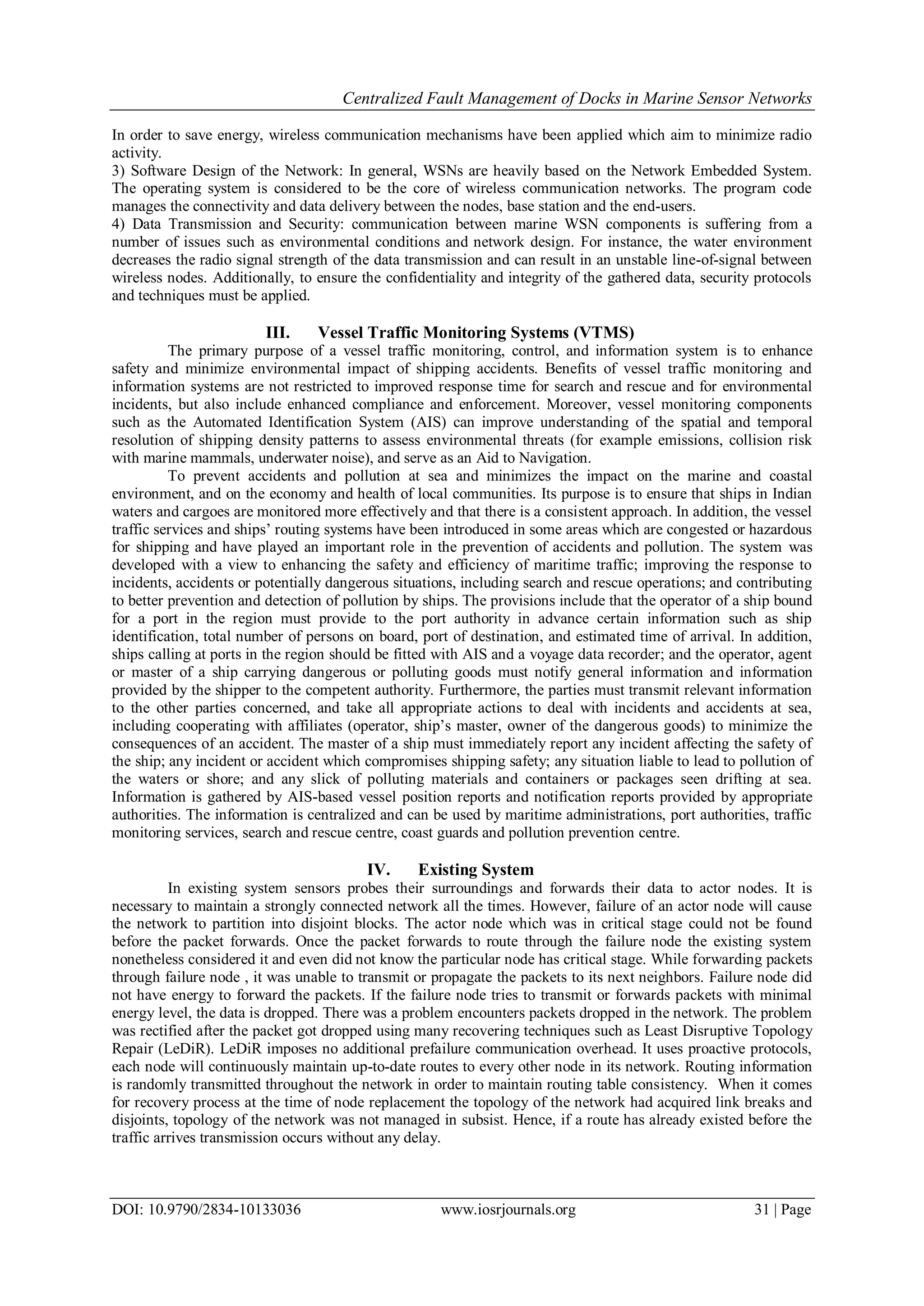 This document discusses centralized fault management of docks in marine sensor networks. It proposes a distributed routing algorithm (DRA) and network topology management technique (NTMT) to address issues with existing systems. DRA allows for pre-failure detection of nodes by having nodes send heartbeat messages to neighbors. If a node fails, NTMT selects a replacement node from the smallest affected network partition and coordinates moving surrounding nodes to maintain connectivity while replacing the failed node. The techniques are analyzed through simulations, which show DRA can detect failures before they occur and NTMT effectively recovers network topology when replacing failed nodes.