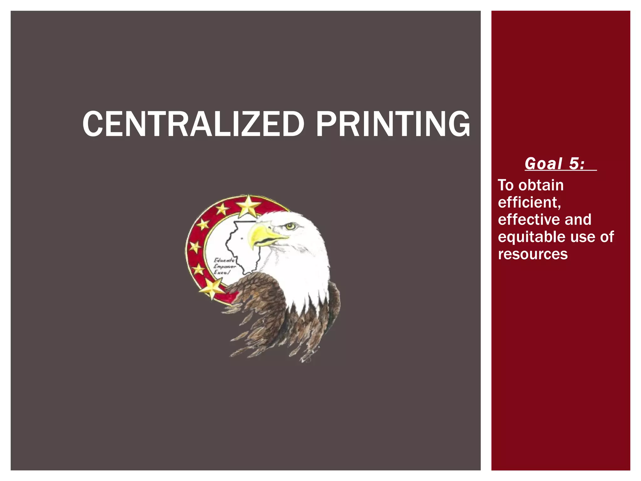 The document discusses a school district's plan to implement centralized printing to make its printing resources more efficient and cost effective. It would consolidate over 300 individual printers into less than 60 multi-function copiers strategically placed around the district. This is estimated to save $75,000 annually in printing/copying costs and reduce the environmental impact. It provides a timeline and phase-in plan to roll out the new copiers between August and September, while training and supporting staff during the transition. Regular reviews will ensure the copiers continue meeting the district's needs over time.