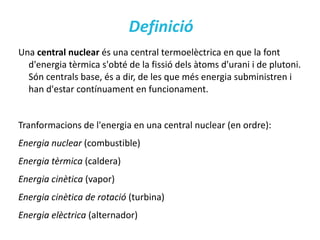Definició Una central nuclear és una central termoelèctrica en que la font d'energia tèrmica s'obté de la fissió dels àtoms d'urani i de plutoni. Són centrals base, és a dir, de les que més energia subministren i han d'estar contínuament en funcionament.