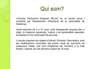 Qui som?L’Escola d’EducacióEspecial XALOC és un centre privat i concertat pel Departament d’Educació de la Generalitat de Catalunya.