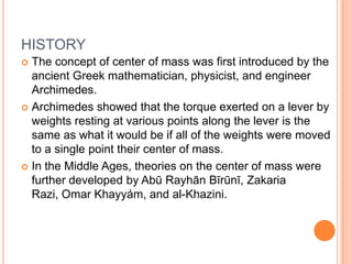 The concept of the center of mass was first developed by Archimedes to analyze lever systems. The center of mass is the single point where the entire mass of an object can be considered to be concentrated and can be used to determine an object's balance point. For basic shapes, the center of mass can be located geometrically, while other objects require considering the individual masses of their components. An object's stability depends on how much its center of mass shifts when disturbed from its equilibrium position.