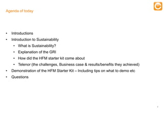 The document discusses a sustainability reporting solution developed by Centre Consulting using Oracle Hyperion Financial Management to help organizations standardize and streamline sustainability reporting processes by collecting, validating, and consolidating sustainability data in a single system, replacing spreadsheets, and improving data quality, transparency, and the focus on analysis. It provides an overview of the capabilities and features of the sustainability reporting application and demonstrates aspects of its administration, data entry, reporting, and compliance with the Global Reporting Initiative framework.