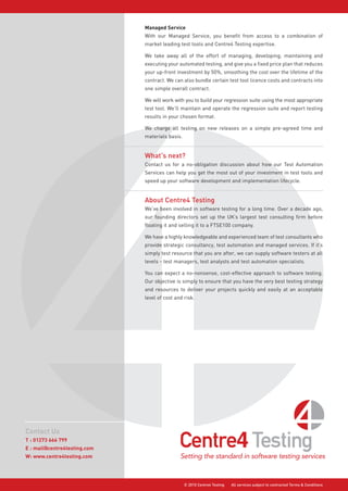 Test automation can reduce the time, money, and resources required for testing by automating repetitive regression tests. Centre4 Testing offers test automation services including scripting, support, training, and a managed service option to help clients efficiently implement test automation and get the expected returns. Their flexible offerings can be tailored to suit a client's specific needs and budget.