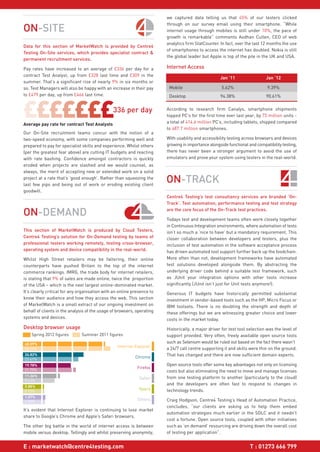 Centre4 Testing provides a quarterly report called MarketWatch that summarizes the current state of the software testing market. In the latest edition, a survey of over 7,000 testers found that 29% feel more confident about the job market outlook over the next 3 months, while 53% feel the same and 18% feel less confident. Average pay rates for contract test analysts and managers increased. The use of smartphones to access the internet doubled over the last year, highlighting the need for mobile testing. Open source test automation tools are becoming more popular due to lower costs and the availability of domain experts.