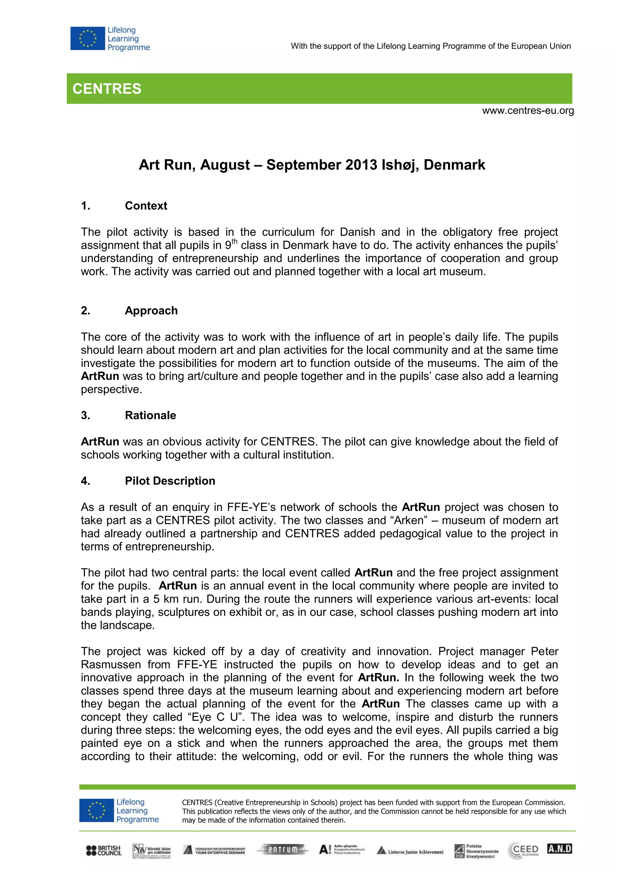 The document summarizes a pilot project called ArtRun carried out in Denmark that partnered two high school classes with a local art museum. The goals were to enhance students' understanding of entrepreneurship, cooperation, and the influence of art. Students learned about modern art and planned activities for an annual community run event. They created an interactive concept called "Eye C U" where they greeted runners with large painted eyes. The project gave students experience developing ideas and improved their entrepreneurial skills and confidence in working on unknown projects. Teachers and mentors saw benefits for both students and the partner organizations.