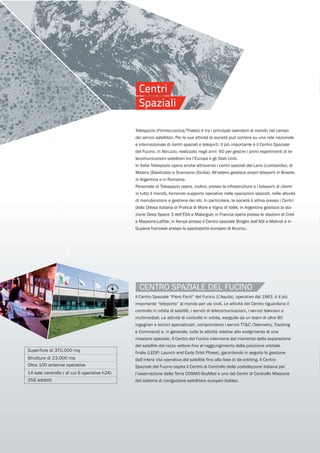 Il centro spaziale 'Piero Fanti' del Fucino è il principale teleporto civile al mondo, attivo dal 1963, che gestisce controlli orbitali e servizi satellitari. Telespazio, insieme ad altre strutture in Italia e all'estero, offre supporto operativo per telecomunicazioni, navigazione satellitare e osservazione terrestre. I centri spaziali di Matera, Lario e Scanzano, ciascuno con funzioni specifiche, contribuiscono alle missioni di monitoraggio ambientale e servizi di telecomunicazione.