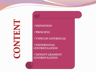 Centrifugation is a laboratory process that utilizes centrifugal force to separate or concentrate materials in liquid suspensions, particularly effective for particles smaller than 5 micrometers that don’t sediment under gravity. The document explains differential and density gradient centrifugation methods, the principles of centrifugal force, and factors influencing sedimentation including particle mass, density, and shape. Limitations of differential centrifugation are noted, particularly regarding the potential for smaller particles to pellet alongside larger ones.