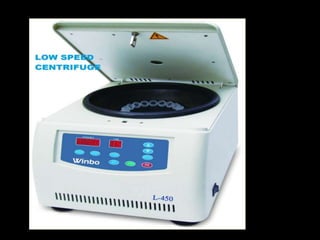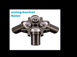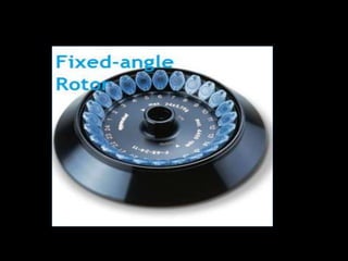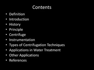 Centrifugation is a process that uses centrifugal force to separate mixtures of particles based on density. It works by spinning a sample rapidly, causing denser particles to migrate outward while less dense particles move inward. There are various types of centrifuges and rotors that can be used for different applications like separating blood components, purifying proteins, or clarifying wine. Common techniques include differential centrifugation to separate cell components, density gradient centrifugation to separate mixtures based on buoyant density, and ultracentrifugation for high-speed separations. Centrifugation is widely used in industries like water treatment and laboratories for analytical purposes.