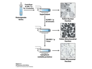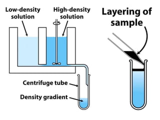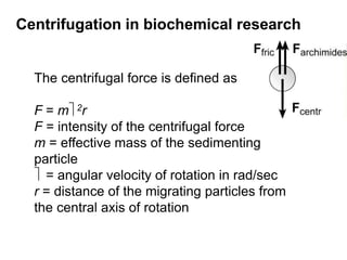 The document discusses centrifugation techniques used in biochemical research. It defines centrifugal force and relative centrifugal force (RCF). It states that to centrifuge a sample at 100,000g with an average radius of 4cm would require setting the centrifuge to over 25,000rpm. Different types of centrifuges are used for separating particles of various sizes. Centrifugation is used for preparative and analytical techniques like sedimentation analysis to determine properties of particles like sedimentation coefficients.