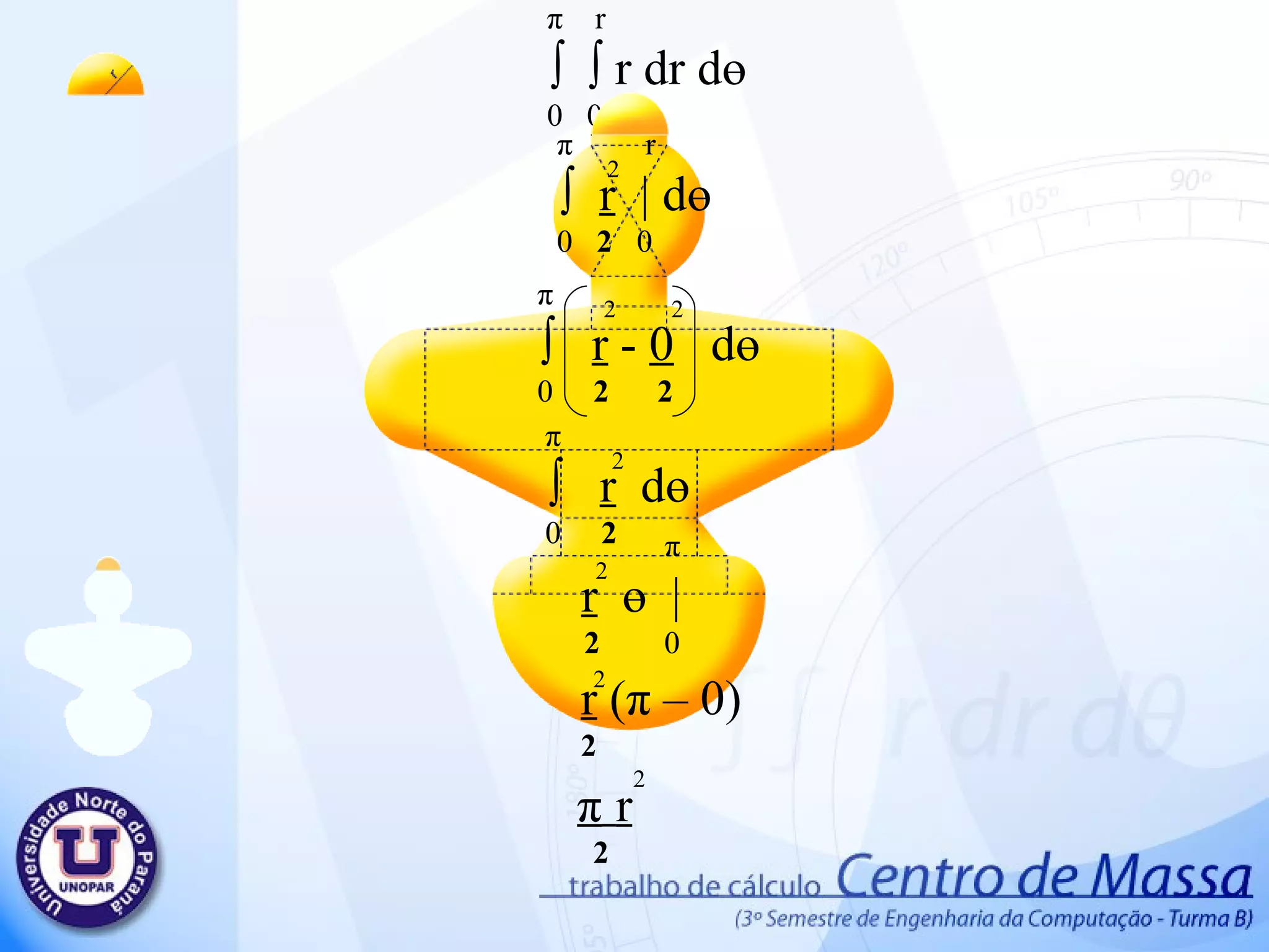 Centro de massa 1. π r ∫ ∫ r dr d ө 0 0 π r ∫ r | d ө 0 2 0 2 π ∫ r - 0 d ө 0 2 2 2 2 π ∫ r d ө 0 2 2 π r ө | 2 0 2 r ( π – 0) 2 π r 2 2 2 2. 2r 2r/5 ∫ ∫ dy d x 0 0 2r 2r/5 ∫ y | d x 0 0 2r ∫ 2r – 0 d x 0 5 2r 2r x | 5 0 2r (2r – 0) 5 4r 5 2 3. 2 π /3 ∫ ( 2r ) – 0 d ө 0 2 2 2 π /3 2r ∫ ∫ r dr d ө 0 0 2 π /3 2r ∫ r | d ө 0 2 0 2 2 2 2 π /3 4r ө | 2 0 2 4r 2 π - 0 2 3 2 4 π r 3 2 4. 5. r r √ 3 ∫ ∫ dy d x 0 0 r r √3 ∫ y | d x 0 0 r ∫ r √3 – 0 d x 0 r r √3 x | 0 r √3 (r – 0) r √3 2 r √3 2 6. 7. 2r 4r/5 ∫ ∫ dy d x 0 0 2r 4r/5 ∫ y | d x 0 0 2r ∫ 4r – 0 d x 0 5 2r 4r x | 5 0 4r (2r – 0) 5 8r 5 2 8. 32r/5 3r/5 ∫ ∫ dy d x 0 0 32r/5 3r/5 ∫ y | d x 0 0 32r/5 ∫ 3r – 0 d x 0 5 32r/5 3r x | 5 0 3r ( 32r – 0) 5 5 96r 25 2 9. 54r/5 16r/5 ∫ ∫ dy d x 0 0 54r/5 8r/5 ∫ y | d x 0 0 54r/5 ∫ 16r – 0 d x 0 5 54r/5 16 r x | 5 0 16 r ( 54r – 0) 5 5 864r 25 2 10. π 8r/5 ∫ ∫ r dr d ө 0 0 π 8r/5 ∫ r | d ө 0 2 0 π ∫ 8r – 0 d ө 0 5 π 64r ө | 25 0 64r ( π – 0) 25 64 π r 25 2 2 2 2 2 2 11. 12. 36r/5 18r x | 10 0 36r/5 18r/10 ∫ ∫ dy dx 0 0 36r/5 18r/10 ∫ y | d x 0 0 36r/5 ∫ 18r – 0 d x 0 10 18r 36r – 0 10 5 324r 25 2 13. 22r/5 r ∫ ∫ dy dx 0 0 22r/5 r ∫ y | d x 0 0 22r/5 ∫ r – 0 d x 0 22r/5 r x | 0 r 22r – 0 5 22r 5 2 14. 26r/5 2r/2 ∫ ∫ dy d x 0 0 26r/5 2r/2 ∫ y | d x 0 0 26r/5 ∫ 2r – 0 d x 0 2 26r/5 2r x | 2 0 2r ( 26r – 0) 2 5 26r 5 2 15. π ∫ r - 0 d ө 0 2 2 π r ∫ ∫ r dr d ө 0 0 π r ∫ r | d ө 0 2 0 2 2 2 π ∫ r d ө 0 2 2 π r ө | 2 0 2 r ( π – 0) 2 π r 2 2 2 16. π ∫ - 0 d ө 0 2 2 π 18r/5 ∫ ∫ r dr d ө 0 0 π 18r/5 ∫ r | d ө 0 2 0 2 π ∫ d ө 0 2 2 π 324r ө | 50 0 2 324r ( π – 0) 50 324 π r 50 2 2 18r 5 2 2 324r 25 17. π r 2 2 4r 5 2 8 π r 3 2 2 r √3 2 8r 5 2 96r 25 2 64 π r 25 2 324r 25 2 22r 5 2 26r 5 2 π r 2 2 324 π r 50 2 + + + + + + + + + + + = 75 π r +120r +400 π r +300r √3 +240r +576 r + 2592 r + 384 π r + 1944r + 660r + 780r+75 π r + 972 π r 150 2 2 2 2 2 2 2 ∑ A 2 2 2 2 2 = 1906 π r +300 r √3 +6912r 150 2 2 2 ∑ A = 864r 25 2 + 2 18. 19. π r ∫ ∫ r cos ө dr d ө 0 -r π r ∫ r cos ө | d ө 0 3 -r π ∫ r + r cos ө d ө 0 3 3 π 2r sen ө | 3 0 3 3 3 2 2r ( sen π – sen 0 ) 3 3 0 3 20. 21. π r ∫ ∫ r sen ө dr d ө 0 0 π r ∫ r sen ө | d ө 0 3 0 π ∫ r – 0 sen ө d ө 0 3 π - r cos ө | 3 0 3 3 3 2 r ( cos π – cos 0 ) 3 3 2 r 3 3 22. 2 r 3 3 π r 2 2 Área . 2 π r 2 2r 3 π 23. 2r 2r/5 ∫ ∫ y dy d x 0 0 2r 2r/5 ∫ y | dx 0 2 0 2r ∫ 4r – 0 dx 0 50 2 2r 4r x | 50 0 2 2 2 4r . 2r 50 4 r 25 3 2 2 24. 4 r 25 3 Área 4r 5 2 . 5 4r 2 r 5 25. 2 π /3 2r ∫ ∫ r sen ө dr d ө 0 0 2 π /3 2r ∫ r sen ө | d ө 0 3 0 2 π /3 ∫ 2r – 0 sen ө d ө 0 3 2 π /3 - 8 r cos ө | 3 0 3 3 3 2 r ( cos 2 π – cos 0 ) 3 3 3 21 r 3 3 4 r 3 26. 4 r 3 Área 4 π r 3 2 . 3 4 π r 3r π 2 27. P(0 , r √3 ) a.0 + b = r √3 P(r , 0) a .r + b = 0 a.r + r √3 = 0 a = - r√3 r a = -√3 a.x + b = -√3x + r√3 b = r√3 a.x + b = y a.r + b = 0 28. r -x√3 + r √3 ∫ ∫ y dy d x 0 0 r -x√3 + r √3 ∫ y | dx 0 2 0 r ∫ (-x√3 + r√3 ) - ( 0 ) dx 0 2 2 r ∫ 3x + 2( -x √3 )( r √3 ) +3r dx 0 2 2 2 2 2 2 r ∫ 3x – 6xr + 3r dx 0 2 2 2 2 r 3x – 6xr + 3r x dx | 3 2 0 2 3 2 2 = r – 3r + 3r 2 3 3 3 r 2 3 = 29. 30. 2r 4r/5 ∫ ∫ y dy d x 0 0 2r 4r/5 ∫ y | dx 0 2 0 2r ∫ ( 4r ) - ( 0 ) dx 0 2 2 2 r 8r . X | 2 0 2 2 2 8r . (2r – 0) 2 2 2 16r 25 2 31. 16r 25 2 Área 864r 25 2 . 25 864r 2 2r 5 32. P(0 , 0) a.0 + b = 0 P( 22r , 3r ) a . 22r + b = 3r 5 5 5 5 a = 3r . 5 5 22r a = 3 22 a.x + b = 3x 22 b = 0 a.x + b = y a. 22r + b = 3r 5 5 33. 22r/5 3x/22 ∫ ∫ y dy d x 0 0 22r/5 3x/22 ∫ y | dx 0 2 0 22r/5 ∫ 3x - 0 dx 0 22 22 2 22r/5 9 . X | 968 3 0 2 2 2 3 . ( 22r – 0) 5 . 968 3 3 3993r 15125 3 34. 3993r 15125 3 Área 33r 25 2 . 25 33r 2 1331r 6655 35. 54r/5 16r/5 ∫ ∫ y dy d x 0 0 54r/5 16r/5 ∫ y | dx 0 2 0 54r/5 ∫ 256r dx 0 50 54r/5 256r . X | 50 0 2 2 256r . ( 54r – 0) 50 5 2 2 13824r 250 3 36. P(0 , 18r/10) a.0 + b = 18r/10 P(18r/5 , 0 ) a .18r/5 + b = 0 a = - 18r/10 18r/5 a = - 1 2 a.x + b = - x + 9r 2 5 b = 18r 10 a.x + b = y a. 18r + 18r = 0 5 10 37. 18r/5 -x/2 + 9r/5 ∫ ∫ y dy d x 0 0 18r/5 -x/2 + 9r/5 ∫ y | dx 0 2 0 18r/5 ∫ 1 - x + 9r - 0 dx 0 2 2 5 2 2 18r/5 ∫ 1 x + 2 - x 9r + 81r dx 0 2 4 2 5 25 2 18r/5 ∫ x - 18rx + 81r dx 0 8 20 50 2 2 18r/5 1 . x - 9r . x + 81r . x | 8 3 10 2 50 0 2 3 2 972 r 500 3 = 38. 39. P(0 , 0) a.0 + b = 0 P(4r/5 , r) a . 4r + b = r 5 a = r 4r/5 a = 5 4 a.x + b = 5x 4 b = 0 a.x + b = y a. 4r + b = r 5 40. 4r/5 5x/4 ∫ ∫ y dy d x 0 0 4r/5 5x/4 ∫ y | dx 0 2 0 18r/5 ∫ 1 5x - 0 dx 0 2 4 2 2 18r/5 ∫ 1 25x dx 0 2 16 2 18r/5 25 x | 3 0 32 3 2 1458r 120 3 41. 1458r 120 3 Área 2r 5 2 . 5 2r 2 7290r 240 42. π r ∫ ∫ r sen ө dr d ө 0 0 π r ∫ r sen ө | d ө 0 3 0 π ∫ r – 0 sen ө d ө 0 3 π - r cos ө | 3 0 3 3 3 2 r ( cos π – cos 0 ) 3 3 2 r 3 3 43. 2 r 3 3 π r 2 2 Área . 2 π r 2 2r 3 π 44. π 18r/5 ∫ ∫ r sen ө dr d ө 0 0 π 18r/5 ∫ r sen ө | d ө 0 3 0 π ∫ 1 18r – 0 sen ө d ө 0 3 5 π - 5832r cos ө | 375 0 3 3 3 2 - 5832r ( cos π – cos 0 ) 375 3 11664 r 375 3 3 45. 46. 47. ∑ Yg = 7,2 . 245.437 + 15 . 125 + 39,15 . 1850,263 + 65,800 . 250 + 75,800 . 600 + 16.678,637 98,300 . 6656,637 + 125,800 . 2025 + 149,14 . 687,5 + 160,495 . 1057,937 = 16.678,637 ∑ yg = 114,526229587 48. Deficiência no corte do objeto. Dilatação do objeto. Medidas imprecisos. Irregularidade do material do objeto. Arredondamentos nos resultados Possíveis erros no Projeto Tentativa para minimizar os possíveis erros Substituir os valores só no final dos cálculos. Guardar o objeto em local seco, para evitar a dilatação do objeto. Elaborar projeto a partir de desenhos com medidas precisos. 49. Professor: Valdemir Antunes Alunos: Keny Shindi Shiraishi Rafael Milani de Ab