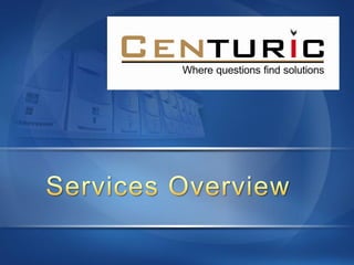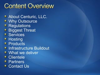 Centuric is an IT outsourcing company that has been in business since 2001. They offer a range of managed services and products focused on network security, compliance, and infrastructure buildouts. Their goal is to help clients focus on their core business by taking ownership of their IT needs. Centuric works with leaders in technology and has experience delivering solutions to both regulated and commercial industries. They aim to provide around-the-clock support and innovative solutions to reduce costs and risks for their clients.