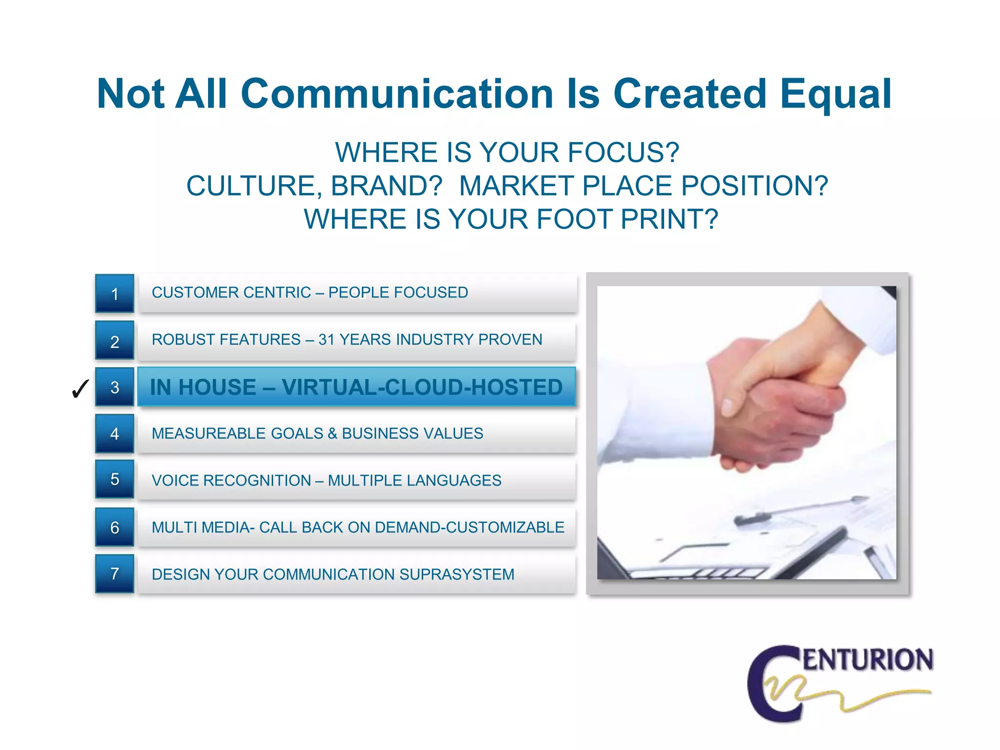 This document discusses communication systems and contact centers. It highlights that customer focus and people are most important. It promotes a robust feature set from a company with 31 years of industry experience. The company offers in-house, virtual, cloud-based, or hosted solutions. It emphasizes measurable goals, multi-media capabilities like voice recognition in multiple languages, and customization.