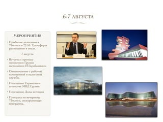 Бизнес-тур CEO Club Ukraine в Грузию пройдет с 6 по 11 августа 2014 года, включая встречи с высокопоставленными чиновниками и ознакомление с системой бизнес-взаимодействия и реформами страны. Участников ожидают экскурсии по историческим и культурным памятникам, включая город Мцхета, Гелатский монастырь и храм Баграта, а также дегустации местной кухни и вин. Завершится тур возвращением в Киев 11 августа.