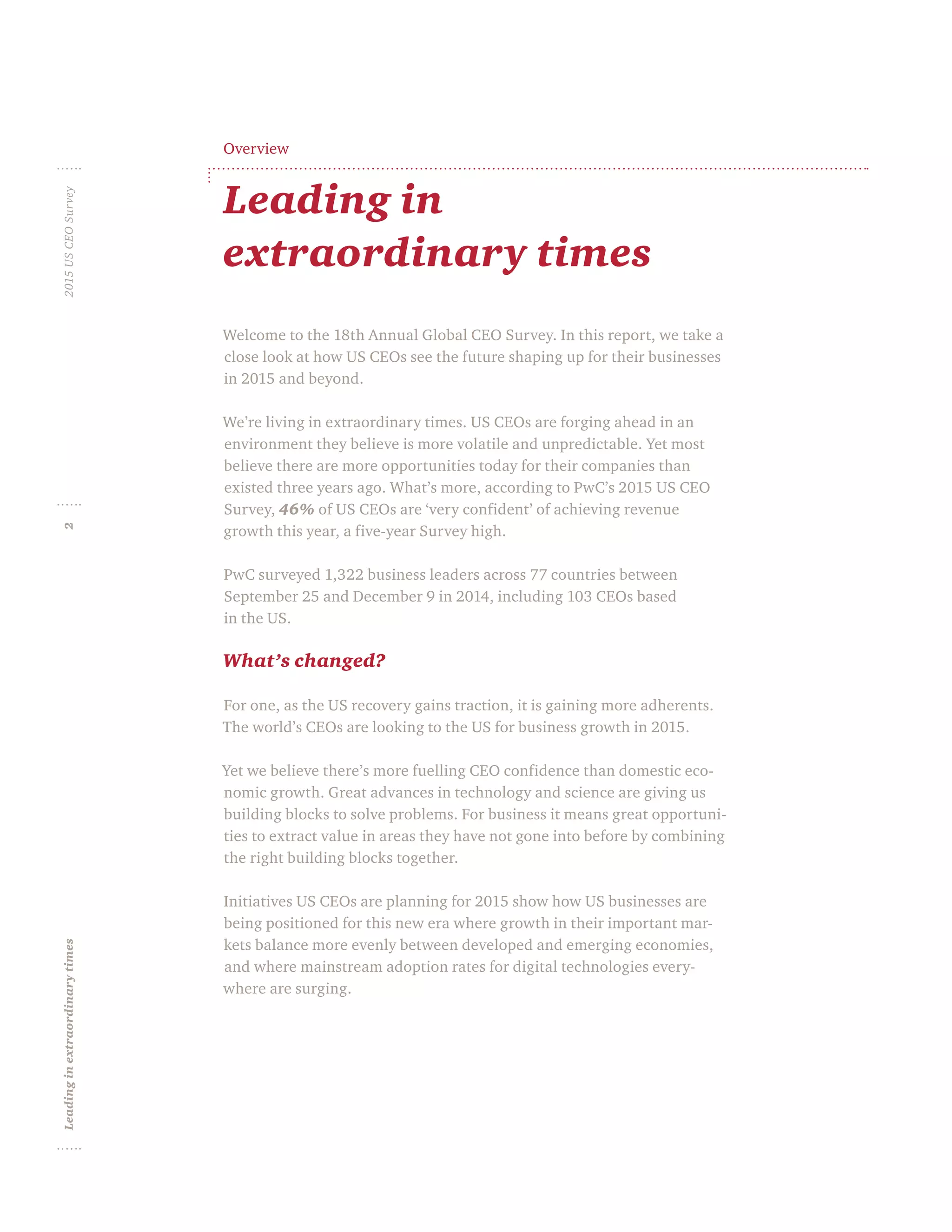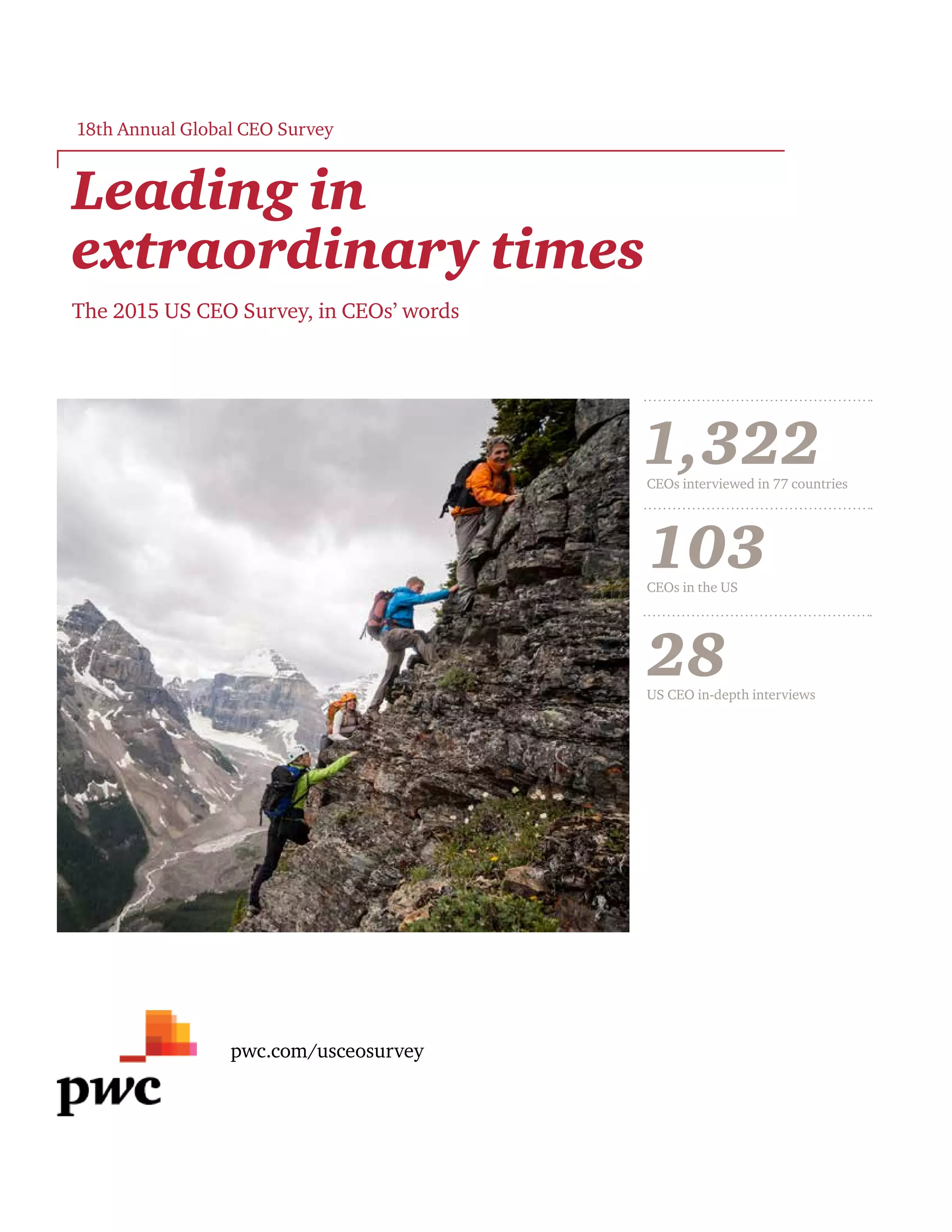 The 2015 US CEO Survey reveals that US CEOs are optimistic about growth opportunities despite navigating a volatile environment, with 46% expressing strong confidence in achieving revenue growth. The report highlights a shift towards innovation, technology, and strategic partnerships, with many CEOs planning acquisitions and diversifications in response to emerging industry dynamics. Additionally, the survey underscores a growing concern over talent shortages and the importance of adapting to new consumer behaviors and technological advancements.